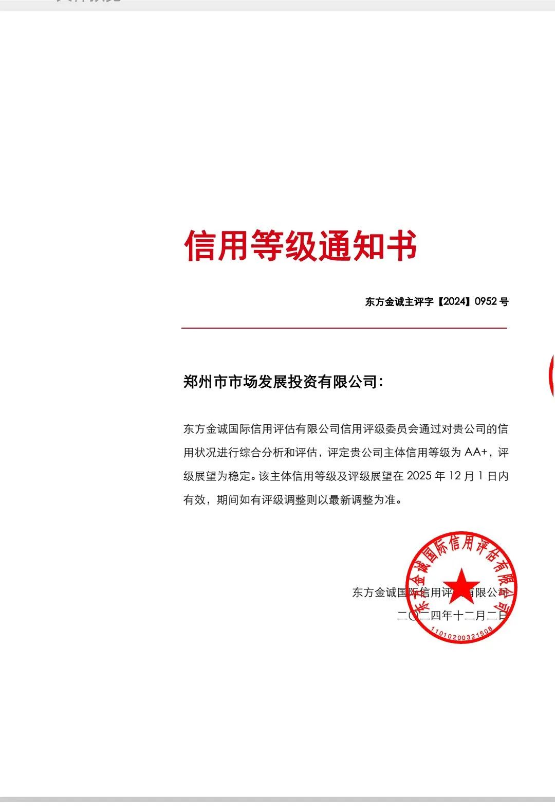 近日,鄭州市市場發展投資有限公司獲得國內權威評級機構東方金誠國際信用評估有限公司AA+主體信用評級,評級展望為“穩定”。
